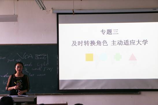 演艺学院的鞠璇老师同样就专题三《及时转换角色,主动适应大学》专题内容进行了讲解。首先她向同学们提出“进入大学所能感受到的关键词是什么”这一问题,并根据同学们提出的关键词进行了总结,建议同学们应该先去了解大学,才能更好地去适应大学生活。而对于如何适应大学生活她从五个方面进行了讲解。她表示加强主动学习是根本要求,培养积极态度是首要前提,提高自我管理是关键环节,并应养成新的学习习惯,建立新的人际关系。随后,鞠老师根据本堂课的教学内容留下了思考题,并总结 “大学不是工厂而是一片农场,找到自己、耕耘自己”。