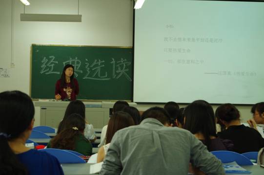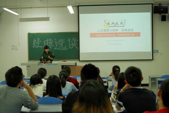 接着,来自会计学院的廖爱羚老师针对宋老师的讲解进行了补充说明。她以“林语堂:人生不过如此”、“解读鲁迅先生的《生命的路》”两个例子讲述关于艺术化地热爱生活的意义。随后,她为大家播放了一段小视频,表达感恩是一种幸福、守望是一种幸福、坚强是一种幸福。